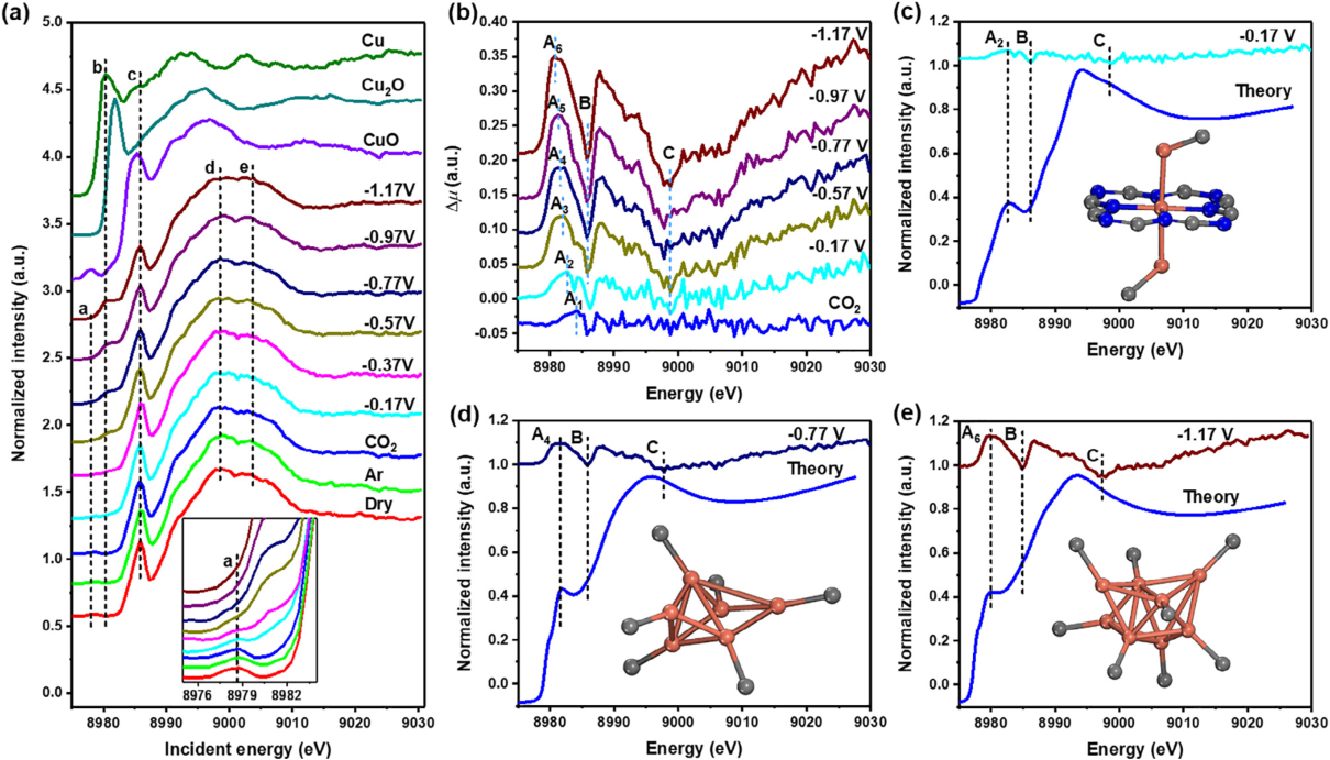近期,上海光源研究团队基于BL14W1-XAFS线站,利用原位高能量分辨荧光检测X射线吸收谱学(HERFD-XANES)方法,并与差谱(??)分析以及近边拟合相结合,精确地识别了Cu(II)Pc模型催化剂在CO2RR过程中活性位点由CuN4C8到Cu团簇的转变,为多碳产物的“C-C耦合”给予了结构起源。该论文以“Operando HERFD-XANES and surface sensitive Δμ analyses identify the structural evolution of copper(II) phthalocyanine for electroreduction of CO2”为题发表在期刊Journal of Energy Chemistry上,第一作者为中科院上海应用物理研究所博士研究生梅丙宝,通讯作者是上海高等研究院姜政研究员。