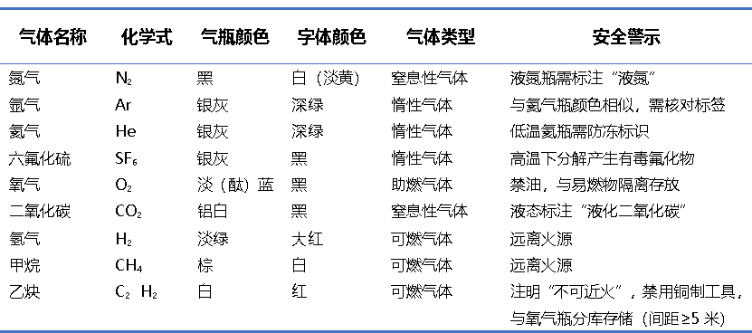 实验室常用的气体钢瓶颜色和安全警示如下: