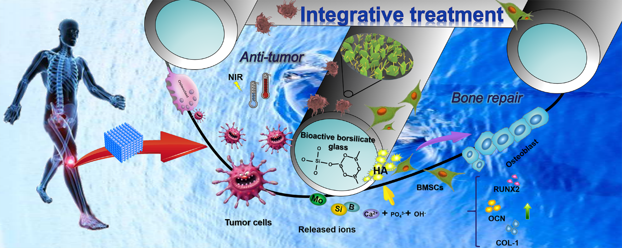近期,中科院上海高等研究院李久盛研究员所带领的团队与上海交通大学附属第六人民医院、深圳大学和同济大学等多家单位合作,在生物医用材料的研究中取得重要进展,研究成果以“Integrative treatment of anti-tumor/bone repairing by combination of MoS2 nanosheets with 3D printed bioactive borosilicate glass scaffold”为题发表在《Chemical Engineering Journal》(IF 10.652)杂志。论文第一作者为上海高等研究院的王会副研究员和曾祥琼研究员等。