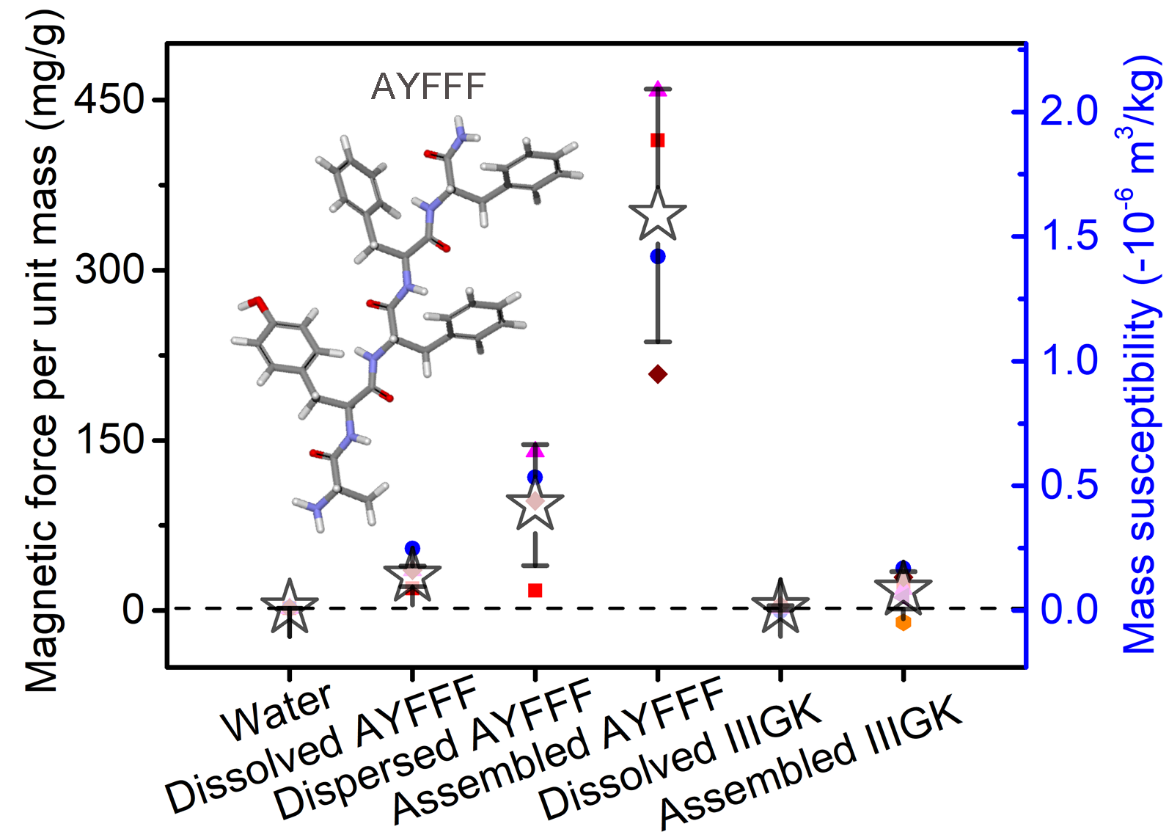 杨海军副研究员在方海平教授的指导下,与广州医科大学张峰教授合作,发现一种含芳香环的典型生物分子(多肽AYFFF)自组装成纤维后,具有超强的抗磁性,其磁化率竟然比水高出一百倍以上。这种含芳香环的多肽的抗磁性与其自组装程度密切相关:溶解在有机溶剂中的多肽分子(基本没有自组装的纤维)的抗磁性略高于水;而在20°C下刚刚分散于水中的多肽(仅仅含有少量自组装纤维)的抗磁性有明显提高;16小时后具有大量自组装纤维的多肽的抗磁性有大幅度提高,达到水的磁化率的175倍。对照实验表明,不含芳香环的多肽(IIIGK)在自组装前后的抗磁性都与水相近,说明多肽分子中芳香环的自组装在其超强抗磁性中起着关键作用。