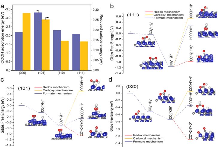 动力学研究和理论计算表明,表面羧酸盐物种可降低Co2C(101)和(020)晶面的表面能,减缓其在反应过程中的生长速率,从而取向生长为四棱柱形貌;而表面无羧酸盐物种时,Co2C(111)面的表面能最低,其余晶面生长速率趋于一致,故形成球形。反应机理探究表明,RWGS反应在具有丰富活性位点的四棱柱Co2C上能同时发生甲酸盐和氧化还原双路径,而球形Co2C只能进行氧化还原反应,这解释了性能差异的原因。