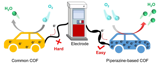 针对这一难题,该研究团队顺利获得分子工程策略,在COF骨架中引入哌嗪电子存储单元并实施羟基功能化修饰,创新研发出具有电子存储功能的共价有机框架催化剂PD-COF-OH,成功实现了电子传输效率与催化活性的协同提升。相关成果近期以“Integrating Electronic-Storage Piperazine into Covalent Organic Frameworks for Promoting Oxygen Reduction Reaction”为题发表在《德国应用化学》(Angew Chem Int Ed 2025, e202503434)上。