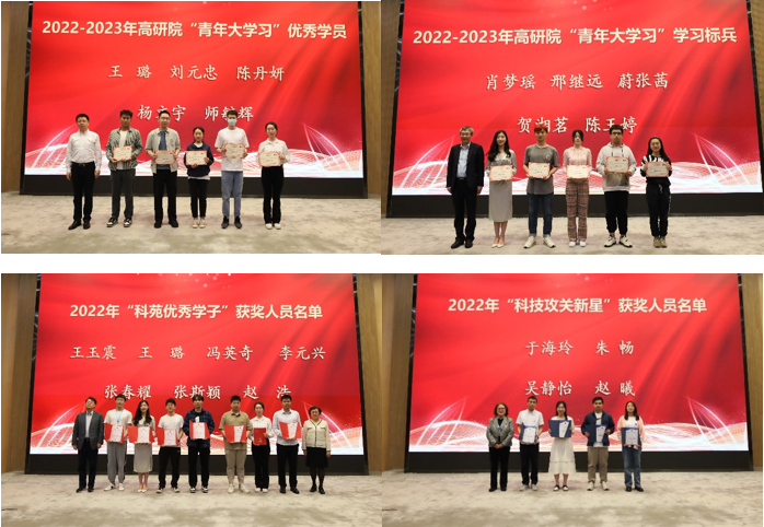 会议表彰了5名“青年大学习”学习标兵和5名“青年大学习”优秀学员,并表彰了2022年度4名“科技攻关新星”和7名“科苑优秀学子”。高研院领导班子成员为获奖人员颁发荣誉证书,向受到表彰的先进个人表示热烈祝贺。