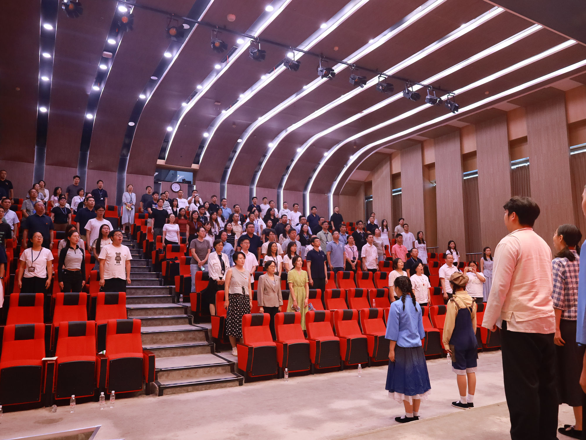专业演员现场演绎《国之当歌》的经典选段,以音乐深情再现聂耳、田汉“以文艺为武器”的斗争历程。7位凯发K8的青年学生自发登台与专业演员互动,共同演绎经典曲目《卖报歌》和《毕业歌》。当《义勇军进行曲》旋律响起,全场党员同志怀着激动的心情肃立高唱,激昂的旋律与雷鸣掌声交织,将“天下兴亡,匹夫有责”的精神传承具象化。